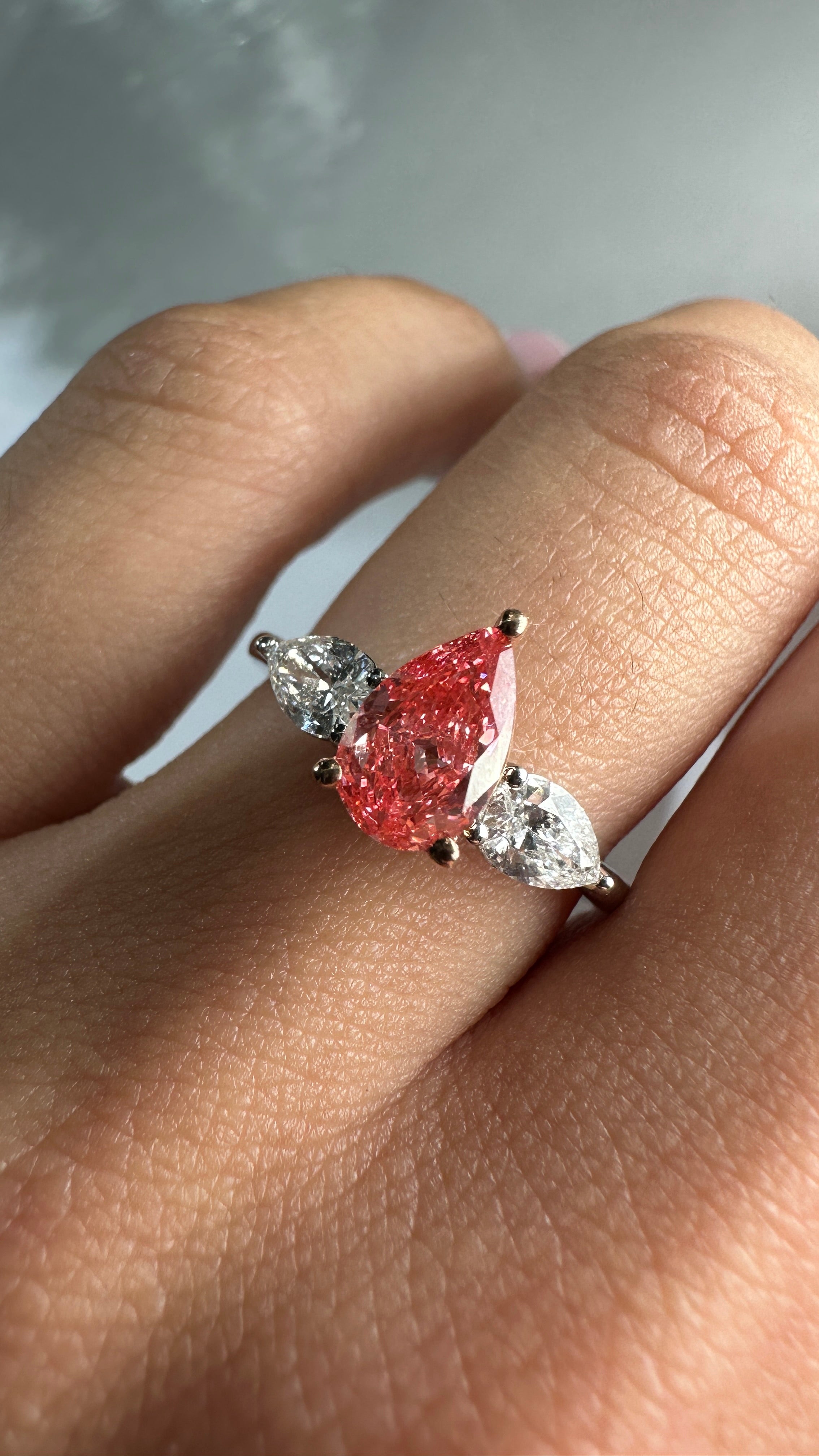 1.35 CT LAB PINK PEAR SHAPE WITH 2 SIDE STONES 18KT White Gold