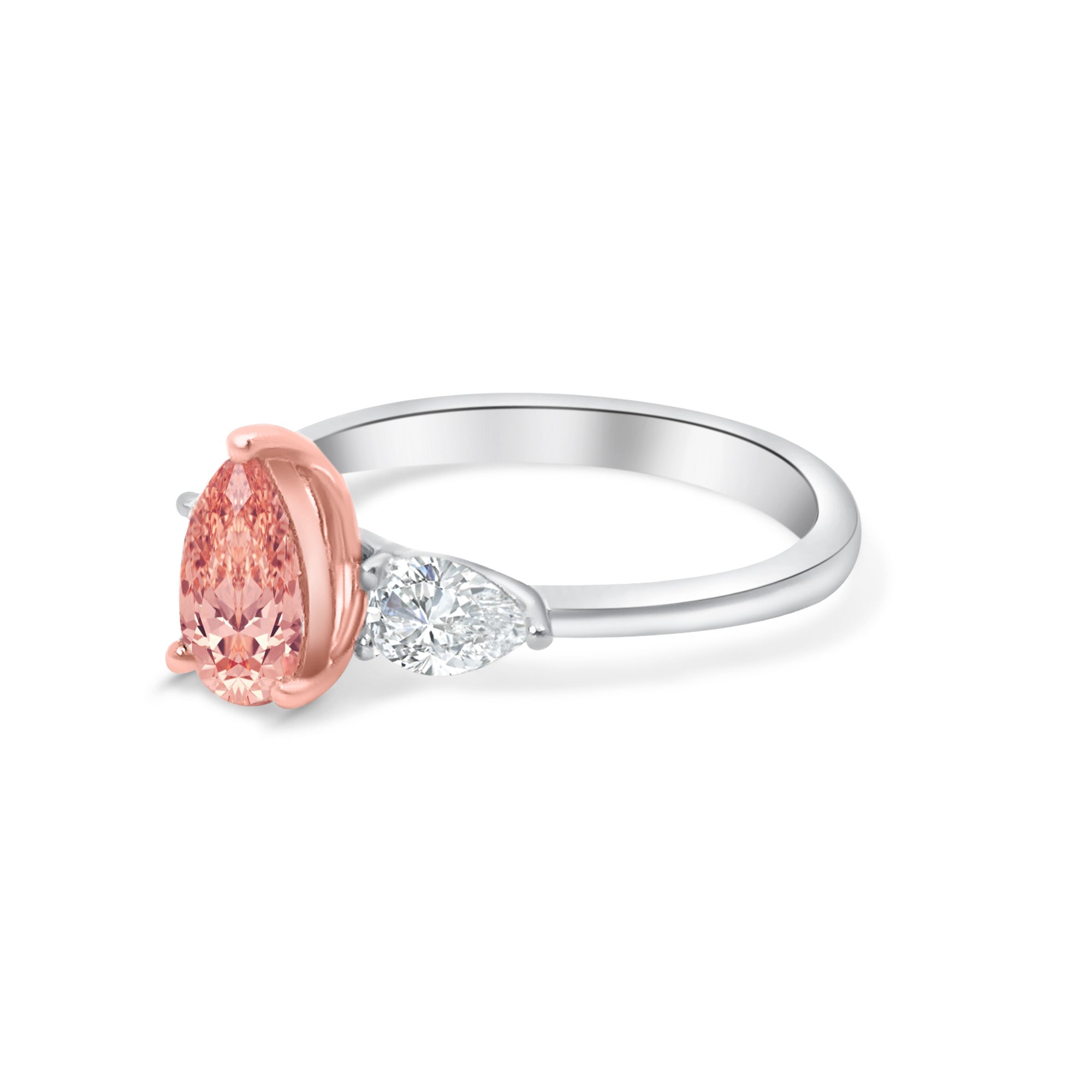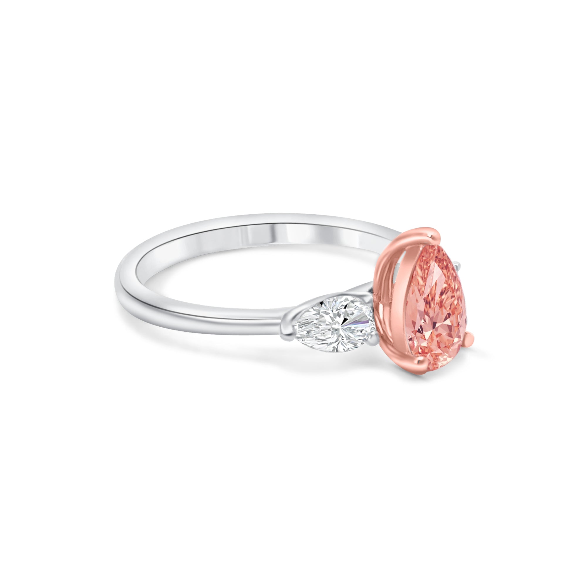 Accompanying the center stone are two dazzling side stones, perfectly positioned to add an extra touch of glamour and sophistication. The combination of the pink pear-shaped diamond and the shimmering side stones creates a harmonious and balanced design that is truly enchanting.